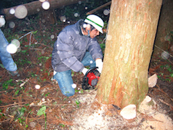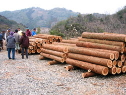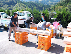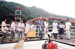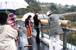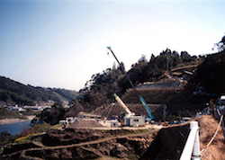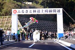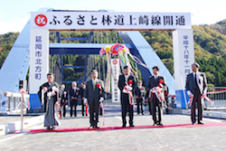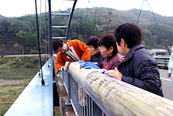 “橋が架かるぞ”と弾んだ声で電話がかかって来た事を今でも覚えている。 それは、妻の父、佐一郎さんからだった。夢の夢でもあった橋が目の前の五ヶ瀬川に架かると言うのだ。 それまでは、上崎地区は陸の孤島と言われており、渡し船で物資を運んだ時代を経て、市道が開通したものの 峠を二つ越える曲がりくねった道を生活道路としていた。 五ヶ瀬川の対岸の国道にでるには、時間もかかるし、大型台風がくれば、土砂が堆積したりして通行止めとなる 事もしばしばあった。それ故に、上崎区民にとっては橋が架かる事は、悲願であった。 ことある事に、町政・県政へと陳情を繰り返してはいたが、なかなか希望は叶わなかった。しかし、幸運にも、 ふるさと林道整備において、実現する事となった。 上崎地区の集落の規模を考えると、そこに架かる橋という事は、車一台が通れる位の橋だろうと思っていた。 ところが、想像をはるかに超える大きな橋で、片側一車線、歩道までもある、おまけに、吊り橋で作る、 との事であった。まったく、想像できなかったが、どのような橋が出来るのだろうかと期待に胸を弾ませる毎日が始まった。
