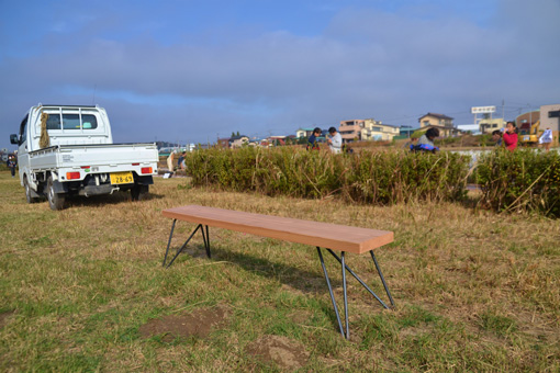以前鹿沼市では、55周年の記念イベントとして550mの長さのオール木製のベンチを作ったことがありましたが、今回は、WOOD INFILLで味をしめた『木と金属のコラボ』ということで、脚部は金属で作成するということになり、当時の木工部会長であった白石さんが、いつも大変お世話になっている潟pワープレイスの若杉さんにベンチのデザインをボランティア(タダ)でお願いしました。若杉さんは、快く引き受けてくださり、杉の一枚板から鉄の丸棒の脚がニョッキっと4本伸びた、かっこいいベンチのデザインをしてくれました。デザイン図を見た人の誰もが「かっこいいね!」「高く売れそう!」等大変評判が良かったです。さすが若杉さん!!ていうところでした。