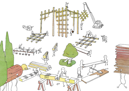可能な限り地域と人の力で実現できるよう選んだ構法は、工法であった。構造方法を選んだのではなく、工事方法を選んでたのだ。この建築は、無名の人々が植え育てたスギを90o角で多用し、集まる人の手で刻み、人の手で組み立てられ、徐々に風景となってゆく。結果として、可能な限り、材を動かさず、地元で加工することができている。 |