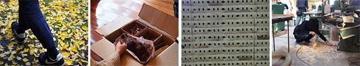 3日目は、諸塚村の山を散策し、ドングリや落ち葉を採取、その後、木材加工工場等にお邪魔して製材端材や鋸屑を集め、2月にイベントに向けた材料をゲット。 |