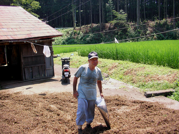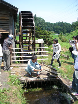 集めたスギの葉は、3ヶ月から半年近く乾燥させ、細かく刻み、さらに天日干しを繰り返して水車で丸二日かけてゆっくりとつく。雨の多い今年のような夏は、乾燥にも時間がかかってしまう。 「いい匂いですねえ。それにすばらしい風景」 「そか?」 浅田さん、嬉しそうにニマーっと笑う。 「水車ばっかりじゃなくて米も作ってるから忙しいの。誰かあそこで蕎麦屋をやったらどうかなーって考えてんだ。どう思う?」 「素晴らしい!」「この風景に水車見ながら蕎麦食べて、そこに杉線香も置いたら名物になります!東京の人なんか、喜びますよ。」皆口々にそう言った。客の女性陣は、文系学部の4年生と東京在住の若く美しい大学講師である。口上も華やかで勢いがある。暑さも手伝って、皆、涼しげな蕎麦に思いをはせ、がぜん話は盛り上がる。蕎麦屋プロジェクトに共感する東京の金持ちを次は必ず連れてくると約束して(皆さんお願いしますよ)、水車小屋を後にする。皆、軽い感動の後の心地よい疲労を感じている。
