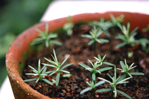こんな風に育てています。ラスタカラーのポットで一周年記念のスギ苗三兄弟を