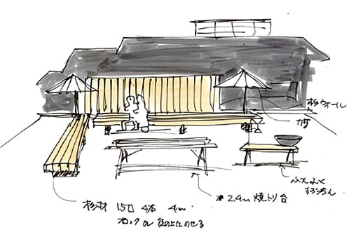 「立面に杉を使うと効果的」「角材に関しては長さとか、どこかにインパクトのあるポイントを持ってくるとよい」など、スギダラデザインの極意をアドバイスいただきながら、現在能代のスギダラメンバー、営業部長の明杉さんと技術部長の貴乃杉さん中心に製作をすすめてもらっています。また、本部よりぶんぶくスギッチンをお借りして、能代市出身でもあるヨシモトポールの鈴木さんからはyakitori