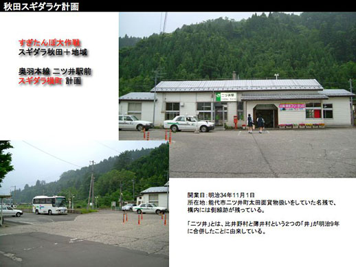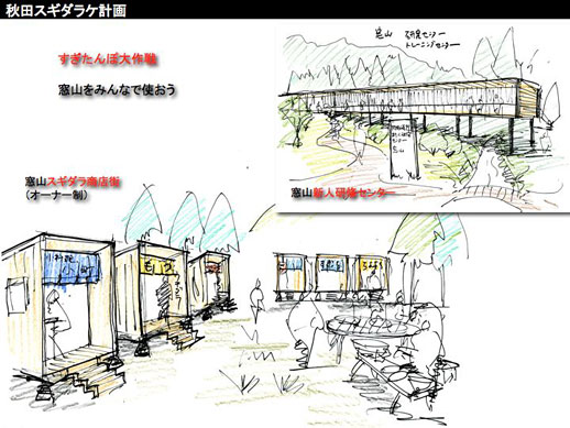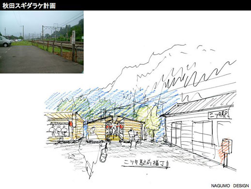 第2弾は、二ツ井駅前スギダラ横丁構想です。現在二ツ井駅の正面向かって左側にある、かつて引き込み線のホームがあった場所に、駅前商店街への呼び水として、小さな杉店舗を連ねて「横丁」を作る計画です。かつて、東洋一といわれた杉の貯木場もあって林業で賑わっていた二ツ井ですが、現在はその面影もなく寂れて、空き地や空き店舗が目立つようになっています。地元スギダラメンバーの杉麻呂さんが中心となって進めている、まちなみ景観整備のきっかけづくりに、スギダラ横丁を活用してもらい、駅前に賑わいを取り戻せたら、というアイデアです。また二ツ井の窓山を舞台にした「窓山スギダラ研修センター」や「窓山商店街」といった、本当に実現したら楽しいだろうなぁと思う素敵なイメージも描いていただきました。