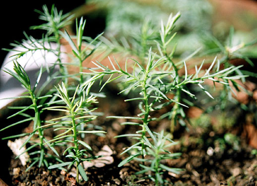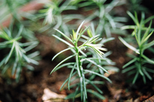 悩んでいるうちに夏も終わりに近づいて、いよいよ隣の杉の子同志の葉っぱがふ れあうくらいに育ってきました。そんな悩ましい夏のある日、わたしは宮崎県日南市で「飫肥杉の一生」という8mm映画を見たのです。そこには挿し木による苗づくりの様子が映されていました。たしかに一定の品質を保つには挿し木がいいのでしょう。でもわたしが育てようとしているのは実生の杉なので、へんに意識しないで、偶然にまかせるのがいいな、と思いました。そろえる、ということも必要だけど、そろわない、ということも大切ですよね。