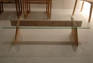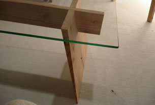 写真2,3 脚の接合部分は、尾根付けホゾを貫通させ、楔を打っている。建築材として使われ続けてきた杉の最も優れた使い方は、やはり建築の中にあるのではと思い、研究していたものを応用した。