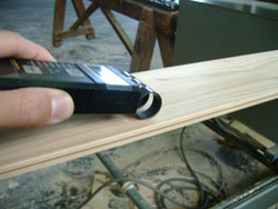 写真03:先端の丸まった部分を木材に当てて計測します。