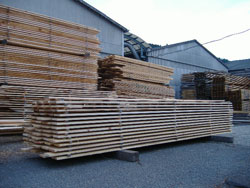 桟積みをした状態で、屋外で乾燥をさせて行きます。乾燥場所に向いているのは、風がよく通り、太陽がよく当る場所です。天然乾燥のメカニズムは、太陽熱で熱せられた木材から水分が染み出て、それを風が取り去って行くようなイメージです。