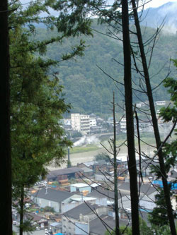 写真09:よく分かりにくいですが、工場の裏山から撮りました。真ん中に写っているのが、吉野川です。川から吹き抜ける冬場の乾いた風が木材の乾燥には良いようです。
