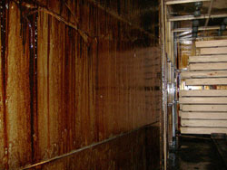 写真14:低温除湿式乾燥機の内部です。桧の精油成分が蒸発した後に出た樹液のカスが付着しています。この乾燥機は20年も使っているので、壁一面が茶色く染まっています。