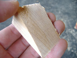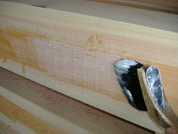 大きな断面の柱の場合は収縮の力が大きいので、背割りと割れ止めにプラスして、背割りに矢を打つ事があります。端材で作った「矢」を背割りに打ち込み、あらかじめ内部に割れを作る事で、収縮力を逃がしてやります。