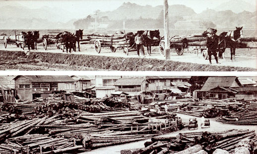 写真5:貯木場に運搬する荷馬車の群れ『南日向大観』昭和10年所収