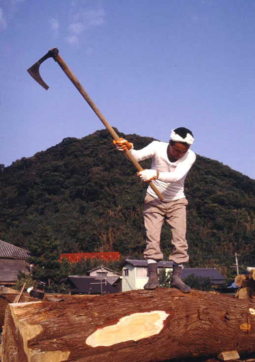 ハツリ師による弁甲加工(両側面を面取りする)油津貯木場におけるハツリ師の風景も最近はみられなくなってしまった。