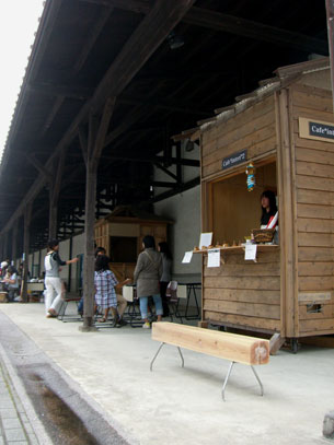 9月から10月にかけて県内では秋祭りが盛んに行われます。先月、能代のサンピノ祭で活躍した杉太が、9月17、18日に行われた美短祭でもまたまた大活躍しました。毎年、環境デザインコースで出している模擬店ですが、今年は先輩たちが製作して残してくれた一坪の家でカフェを開店。杉太は看板息子?としてお店の前で大いにアピールしてくれました。このお店のある場所は、旧国立食糧倉庫を大学の実習棟として活用している建物です。昔はここに新屋駅から鉄道の引き込み線が伸びており、倉庫からすぐに積み込めるようにホームになっているため、幅広い屋根がついており模擬店にはうってつけの場所。並みいる競合?!(お好み焼きや焼き鳥、餃子、などなど)に負けじと頑張った甲斐あって2日間で当初の目標の10倍の売上げ!これも杉太のおかげかな?ともあれ子供から大人まで、たくさんの人たちが何気なく杉太に座ってくれるだけでもとってもうれしい2日間でした。
