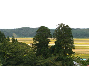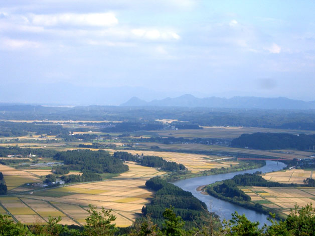 秋田空港のある秋田市雄和。秋田市の東南部に位置し、地区のシンボルでもある高尾山のふもとを雄物川が流れ、広大な田園が広がる農村地帯です。高尾山には、西暦715年、坂上田村麻呂が夜叉鬼の怨霊を鎮めるために建立したと言われる高尾神社(本宮)があり、古くから修験道場として栄えたところです。ふもとの里宮には坂上田村麻呂が戦勝を祈願して植えたと伝えられる樹齢1000年以上、樹高約40メートルもの「里宮の大杉」が3本も自生していて、今なお樹勢衰えることなくそびえ立っています。高尾山自体は383メートルとそれ程高くはないのですが、八号目付近からは蛇行する雄物川と屋敷林と田園と杉林がどこまでも続く景観はまるで鳥になったような気分にさせてくれます。