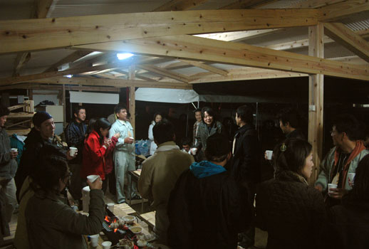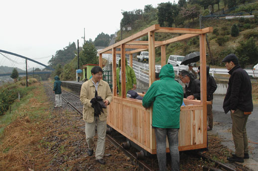上崎には10時頃着きました。手摺りの取り付けイベントは13時からですが、それまでにトロッコを組み立てたり、手摺りを並べたり早速準備に取りかかりました。雨も本格的に降りだし寒くなってきましたが、みんな目が燃えています。特に田丸さんの目が燃えていました。海野さんも燃えていたのですが何か変です。トロッコ組み立ての責任者なのに組み立てがなかなか進みません。 何と海野さんは自分が組み立てパーツをつくっておきながら、すっかり組み立てる順番を忘れていました。お陰様でトロッコの組み立てが終わる頃には手摺り取り付けイベントが始まってしまいました。(これも愛敬です))