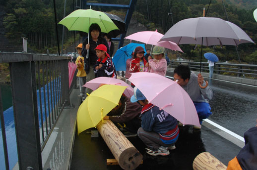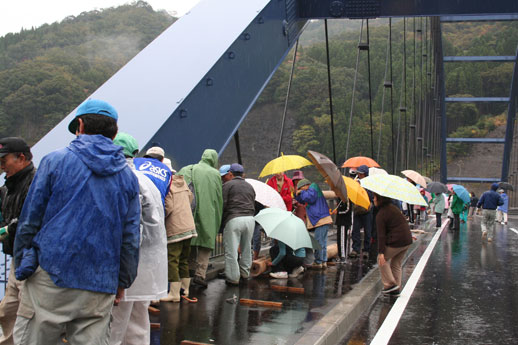 手摺りの取り付けは雨にも関わらず、地元の人を含め100人近くが参加してくれました。九保大の学生はゼミのために来られなかった先輩達(昨年の参加者)の名前を手摺りに書き込んでいました。小学生や幼稚園生、一般の参加者、地元の人達など思い思いに手摺りの裏にメッセージを書き込んで取り付けていました。約1時間で参加者による橋づくりが終わり、 住民の皆さんが待ち望んだ「上崎橋」がようやく完成しました。。