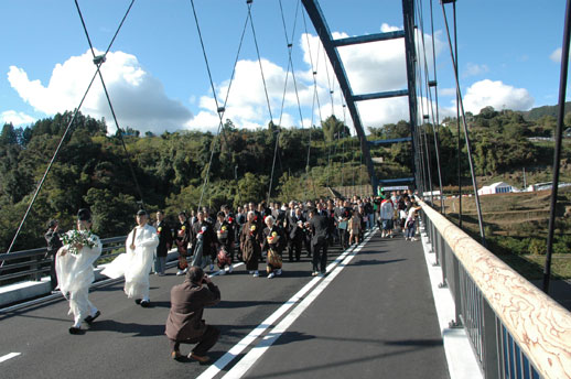 ■上崎プロジェクトを終えて プロジェクトの構想から二年余りを経て、無事プロジェクトの一区切りを迎えることが出来ました。 当時の担当だった梶原さんと上崎に出向いて、「橋づくりと一緒に地域が元気になる取り組みをしましょう」と、第1回懇談会を開催した時の地元の方々の目の輝きは今も鮮明に覚えています。何が出来るか、どのようにして進めるかなど考えもせずに、とにかく勢いだけではじめました。その勢いが地元の方々にも伝わったらしく、多くの積極的な意見が出され、こちらが圧倒されてしまいました。 「キャンプ場をつくりたい」「果物が豊富なのでフルーツランドをつくりたい」などの人を呼び込むための手段が議論されました。しかし、今考えるとこの時しっかりとお互いが意見を交わし、両者(住民側と行政側)の意見の食い違いを徹底的に議論し、共有できる目標を設定していなかったために、コンセンサスを得るのに時間を要したのではないかと思っています。(一部の人には結局最後まで理解して貰えなかったのかもしれません) 住んでいる人が誇りに思える地域になることが大切であり、その為の試行錯誤を繰り返し、そのプロセスを参加者で共有し、少しずつ地域の将来像を描く必要があるということを我々がしっかり伝える必要があったと反省しています。 「施設の整備が進めば何とかなる」という単純な思い込みを払拭しきれなかったのではないかと考えています。宮崎大学の吉武先生が第2回のワークショップの時に言われました。「簡単に地域活性化が図れるなら、日本全国どこでも豊かな地域ばかりですよ」。その通りだと思います。自分自身が分かっていなかったのだと思いました。 南雲さんの協力を仰ぎ、これまで南雲さんが関わってこられた事例紹介や地域の散策、スギダラメンバーや九州保健福祉大学の学生とのワークショップなどに取り組む中で、「この取り組みはこの地域の為になることだ」と勝手な思い込みもあったような気がします。しかし、橋が出来るまでの限られた時間の中で、今回の取り組みを通して参加者全員が喜びを感じ、地域の将来に役立って欲しいという思いだけは忘れずに取り組んで来たつもりです。地域の方々と激しい議論となり、もの別れしたこともありました。まとまりのある小さな集落を二分してしまったのではないかと後悔したこともありました。完成直前まで一喜一憂しながらイベント当日を迎えたような気がします。 小さな集落の小さなイベント成功が大きな将来につながると信じて、多くの人から力強い協力を頂き何とか一区切りを迎えることができたことは、地域の人にとっても私自身にとっても大きな自信になり、これからの人生に大きな財産になると思います。だからといってこれで満足して良いとは思いません。次なる新たな楽しみを探しはじめています。 住民若手代表の甲斐丈義さんが、 「上崎橋の記念日を決めて年に1回は皆さんに来て貰って橋の手入れをしたい」と言っていました。来年もこれまで関わったメンバーが上崎に集合することを楽しみにしています。