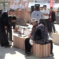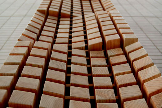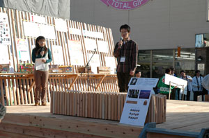杉コレクション前日、出来上がったばかりのナミキの椅子を車に積んで宝塚を出発し、日向市に夜遅く到着。翌日の実物審査とプレゼンテーションの事を考えると、言いようの無い不安感が襲ってきました。審査当日、地元の方々に、展示した自分の作品に座っていただいても、最初はとてもぎこちない会話しかできませんでした。だんだん打ち解けて、小さな子供さんからお年寄りまで、たくさんの方の感想を伺っていると、日向岬の馬ケ背という場所をイメージしている方が多く、また、手触りや座り心地を確かめている人々の様子を見て、はじめて、ベンチに「生気」が宿ったような感覚を持ちました。実際に新しい駅舎においてもらえるのなら、再びこのベンチに「生気」を吹き込むことが出来る!その為には、どうしてもグランプリを取りたい!と強く感じ、審査員の方々の前でも、その