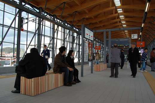 新駅舎オープンの前日、日向市に入り、美しい骨組みの新駅舎のホームに設置されたナミキの椅子を目の前にした時、翌日駅を往来する人々を、静かにゆったりと待っているようなその姿に、いとおしさを感じました。いよいよ駅が動きだした12月17日。ホームにはたくさんの乗客が行きかい、丹念に美しく仕上げて頂いたベンチには、列車を待つ人が腰をおろし、その様子から、再び「ナミキの椅子」に「生気」がふきこまれたことがわかりました。