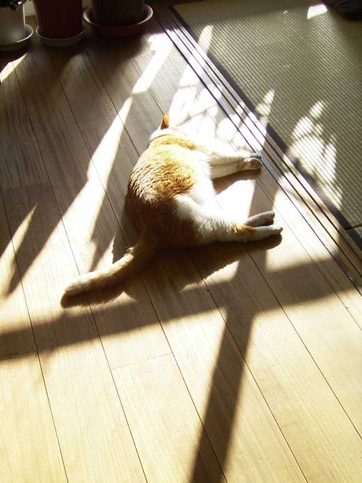 | 冬の鱈三。寒くなると、南向きのリビングの奥の奥まで日が入り、桐の床(すみません杉じゃなくて)がポカポカに温まります。そこで無防備にくつろぐ猫を見ると、もっとポカポカになれるのでした。 |