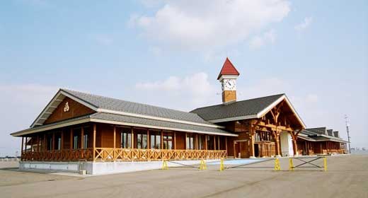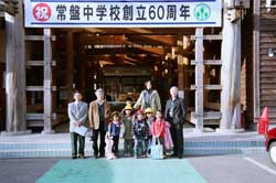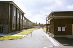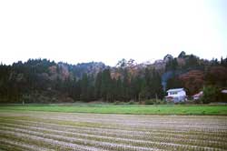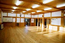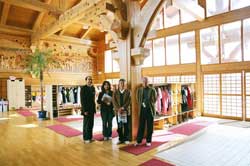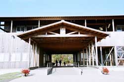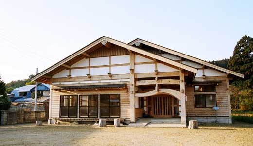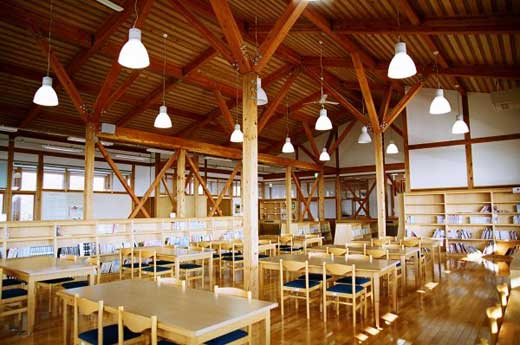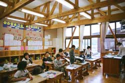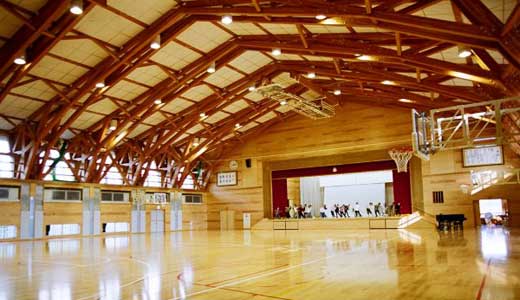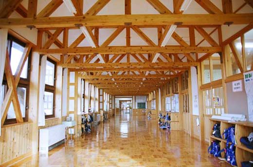 常磐小学校は旧能代市と旧二ツ井町のちょうど中間あたりに位置する田んぼの真ん中に建つ校舎です。地元の山で育った77年生の秋田スギ42本を財産区から譲り受けて、地元の大工が伝統工法で作り上げた迫力あるエントランスホールとは対照に、校舎の構造は4寸角を基準とした秋田スギの並材を用いたシンプルな軸組工法で、トラス梁が空間にアクセントをつけていました。体育館もスギの集成材をふんだんに使っていて、さすが秋田スギの産地だけあるな、と感心しました。 |