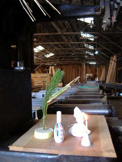 会社の玄関、工場や倉庫の入り口はもちろん、製材所の命である製材機などの機械類にも飾り付けをします。