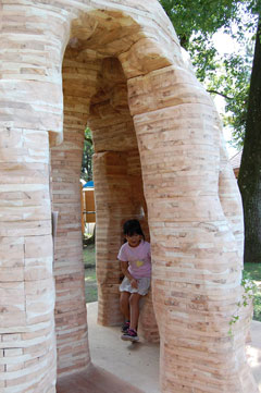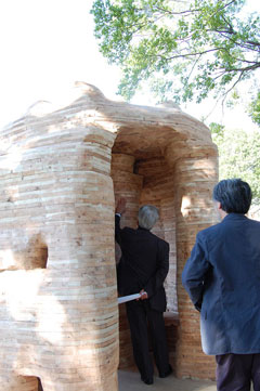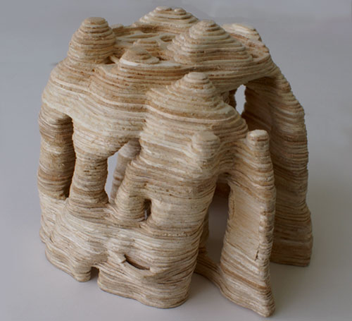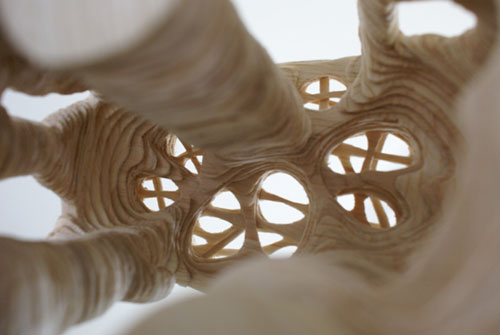 こういった、杉に関する調べ物とコンセプトの模索に平行して、構造や工法等といった方向からもアイデアを出していった。その中の一つが、小さなユニットをブロックのように組んでいって大きなものを作る。更にそのユニット単体にも何か使い道などを持たせて、イベントが終わったら、バラして、会場に来た人に記念品として配る事が出来るようなものというアイデアだ。しかし、組み立て、解体を容易に出来るようにすると、ちょっとした拍子で崩れたりする危険性が出てくる。組み上げて出来る完成品の形も、自由な不定形にしたいと思って、漠然と得体の知れないモコモコとした形をスケッチしてみたが、イメージがまとまらなくて、行き詰った感じになり、しばらくは何もしないで放って置いた。