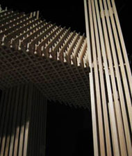 今回テーマが「こりゃ〜スギェ〜!」ということでしたので、僕は杉でこんな大スパンをとばすことが可能なのか!? というテーマに置き換えて考えてみました。他の素材にはない杉の繊細さ、柔らかさ、粘り、といった特徴を生かして、今までにない杉の橋を考えてみようとしてできたのがこの「木漏れ光橋」であります。