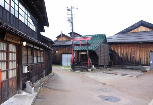 旧三国街道入り口。左が越の紫店舗(創業1837年創業)、右が吉乃川酒造の酒蔵(1548年創業)