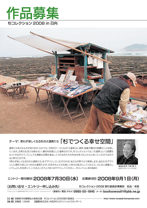 杉のデザインコンペ「杉コレクション2008 IN 日向」作品募集開始! テーマ:「杉でつくる幸せ空間」 杉コレクション2008事務局では、 一人でも多くの方々に参加していただきたいと願っています。 月刊杉読者の方々も奮って応募下さい。 下の画像をクリックすると募集要項をダウンロード出来ます。 (pdf 812k)