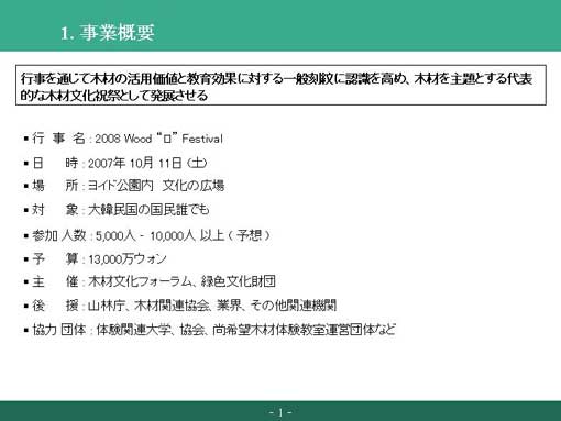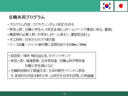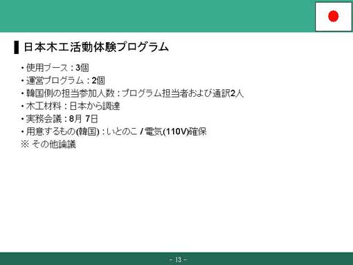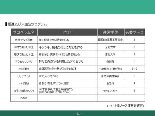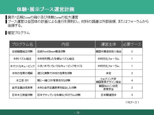 そもそもこのイベント、どういう主旨で開催されているのか? いや、本当に木材に関して、特に杉のような針葉樹のムク材は韓国国内で調達するのが難しく、内田洋行でソウル市内の企業オフィスのインテリア工事を請け負った時も大変苦労しました。 イベントの概要は後述するとして、このイベントの狙いのひとつとして木を使った学習、木育があります。現在、使える国産木材が極めて少ない韓国では、植林をかなりの勢いで進めているとのことですが、当然それらが使える状態になるのに数十年かかるわけです。実際に使える状態になって来た時にその使い方を知らなければ、意味が無い。その時点を見越して、今の子供たちにも木に親しんでもらい、木の良さ、製作するための技術も学んでもらおうというものです。韓国には朝鮮王朝時代の伝統的な家具、いわゆる李朝家具が伝統工芸品として今でも作られていますが、そういった伝統技術を持つ職人も日本同様、少なくなってきており、そもそも生活スタイルが欧米化しているので、家庭やオフィスでもそういった韓国オリジナルのデザインが合わなくなってきています。そういった背景からも木に親しむ文化を取り戻し、新しい木との付き合い方を模索してゆこうということだと思います。 それと今回は国際交流として日韓共同プログラムが用意されています。日本側からは親善大使として宮崎県が10名程度の小学生を派遣する計画です。それと日本からは10万個のカフラ(ドミノ倒しのドミノのような積み木)を持参。韓国の小学生たちと何らかのシンボル、例えば、宮廷の建物とかを競作するとのことです。そのカフラを提供するのも実は川上さんで、手弁当との事。(スゴイ!)また、その他日本からは組み木創作の会の皆さんが、糸鋸10台を持ち込み、組み木教室をやってくれるらしいのです。これも手弁当!(スゴ杉!)何だか関わっている皆さん、やたら盛り上がっているんです。 |