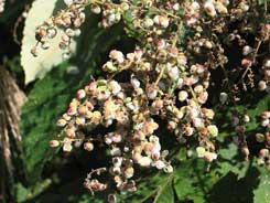特にヌルデシロアブラムシが寄生した葉には写真のように不規則な形をして中が空洞になったふくらみができます。これを五倍子(ごばいし)といい、多くのタンニンが含まれているので今でも利用されています。しかし今はほとんどが中国から輸入されているようです。 |