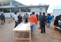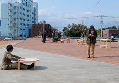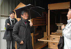 | 翌朝、宮崎から日南へ向かう。川上さんは飫肥杉林、飫肥城へと向かう。我々は夢広場で試作品の展示を開始。この日は屋外の展示だったので、天気を心配していた。事前予報は雨。しかし晴れ男海杉の力か、予報は晴れに・・・良かった。 杉九有馬さんも合流。しかしここで予想外の事が起きた。非常に強い風が吹き出したのだ。ヤタイを中心にした、大型のものは風に弱い。急遽展示場所を二カ所に分けることで何とか対応した。 |
