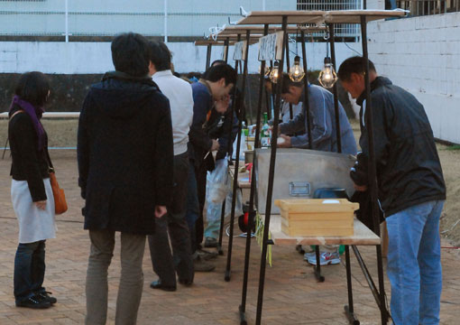 | ヤタイを囲んで・・・ | 金丸さんは屋台の主人そのものだった。 |