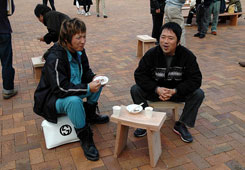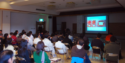 | 展示が終了したのは1時半頃、セミナーは2時開始。急いで食事を取りセミナー会場へ。 疲れた。いや、疲れただけではない、熱っぽい。昼食を食べながらいや〜な気持ちになり出したナグモであった。若杉さんが言った。「それはまずい!。南雲さんカコナール2って知ってますか?ぐっと楽になりますよ。おい、出水、薬局でカコナール2買ってこい!それと栄養剤もな。」 まず日南家具工藝社の池田会長が語り、続いて川上さんセミナーと続く。この時の内容についてはオビダラ日記へ。終了後、参加者は堀川運河まで移動、川上さんを囲んだ交流会へと続く。 |