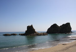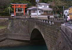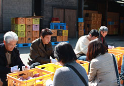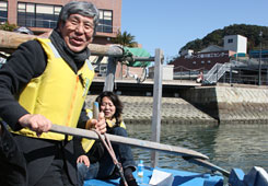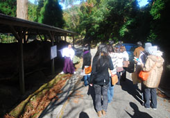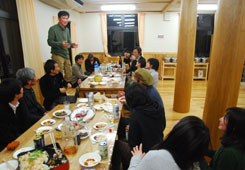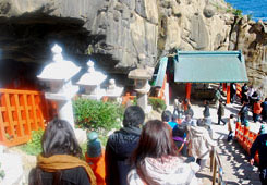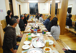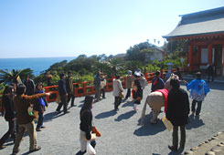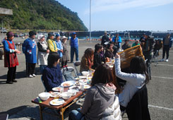 | 一方その頃鵜戸神社コースの面々は何をしていたか。参加者の出水に語ってもらう。 油津コースより一足先にバンガローを出発した鵜戸コース一行は、寝不足を一掃するほどのすばらしい晴天のもと、一路鵜戸へと車を走らせました。 鵜戸神宮を後に、昼食を取るために鵜戸漁港へ。青空のもの、地元の皆さんが手作りで作って頂いた料理は絶品でした。つきたての芋餅(蒸かしたサツマイモと餅をいっしょについたもの)、カツオの刺身、ムカデノリ、鹿肉、その他煮物や酢の物など。食材は全て地元で獲れたものだということでした。それにしても地元の方々は皆さんお元気で明るい!おいしい食事を頂きながら盛り上がりました。 これだけ内容盛り沢山のツアーですが、料金は1500円です!安い〜。 |