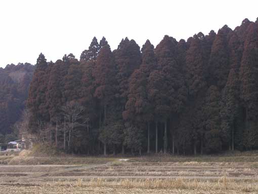 | 今回ご紹介するのは、そのサンブスギの中でも「スギ非赤枯性溝腐病」という木の病に侵された被害木に関する話である。サンブスギは大工に「釘が入らない」と言われるほど密で固く、色味も薄紅色で美しいと言われている。どこの杉と比較してそうなのか不明ではあるが・・・挿し木によって植林されてきたサンブスギはまっすぐに成長し、断面が円に近いと言う特徴があり、昔から木材としての価値を高く評価されており、産業として成り立っていたのだと思う。ただ、この挿し木によるクローン種には前述の「スギ非赤枯性溝腐病」にかかりやすいという特性もあるようだ。それがどの地域にも共通するように木材としての需要が減り、価格の低迷、林業に従事する労働力の減少から山林の手入れをしてゆくことが困難となり、この溝腐病にかかる木が増えているのだそうだ。樹齢40年くらいの構造材として充分に使える木にこの被害が目立っており、腐った部分は脆くなって爪でむしることができる程度の強度だと言う。そのままにしておくと、腐った箇所は広がり、倒れてしまうことになる。問題なのはこれらが平地に分布しているということだ。車道に面したところも多く、腐った部分が景観に及ぼす悪影響もあるが、車道に倒れてきたりしたら大変なことになるわけで、この被害木の処理は山武市の中でも大きな問題になっているのである。 | ||||||||||||||||