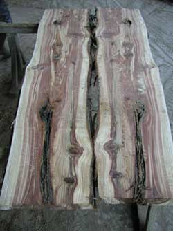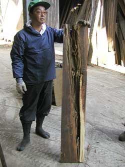 | 確かに切り出された板材はかなり激しい形相をしている。溝腐れ部分が木によってどこまで侵食しているか、切ってみないとわからないし、溝が板の中でどういう意匠を持ってくるのかわからない。本当に出たとこ勝負で、それぞれの材料をどう使ったらいいか個別に見て行くしかなさそうである。これは思った以上にやっかいだ。一方、溝腐れした部位はその色合い、木目、質感が、意図的に作ろうと思っても作れない味わいを持っている。例えて言うなら、数百年生の大径木の根っこの部分や人工林ではない野生の杉を切り出した時に出てくるようなそれこそ野生的な表情に近い要素を持っていると感じる。昔はそんな激しい表情を持った材料を座卓の天板や衝立として、工芸品的に使ったりしたのだと思う。ただ、そういう使い方ができる素材はめったにあるものでは無いし、職人が長い時間をかけて作り上げてゆくものだから成り立っていたのであろうが、この被害は大量に植林されたものに発生していて、かなりの数量があるため、希少な価値を見出すこともできない。それどころか、被害にあった木として安く買い叩かれているというのが実情のようだ。伊藤さんが言うようによほど工夫を凝らさなければ、家具材料として現代的に使ってゆくのは難しそうである。 | ||||||||||||||||