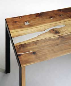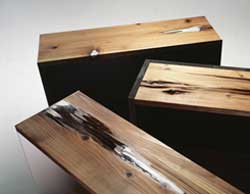 | 素材としては赤味が強いというより、赤黒い感じで、オイルを塗るとさらに深みが増すという魅力も感じていた伊藤さんはこの腐った部分でできた溝をどういう風に見せてゆくか検討する。この話を前述のTH-1朝倉さんにしたところ、京都のデザイン会社リブアートの谷口さんという方が、溝をうまく見せる家具を作っているということで紹介され、実際の製作を引き受けてくれることになったそうである。 融点の低いスズや透明なアクリル樹脂で埋めたり、ブラシをかけて溝をそのまま残したり、使う箇所やデザインするモノに応じた処理の仕方を検討していった。 用意した家具はダイニングテーブルと本棚、ローテーブルの3種類でそれぞれにふさわしいデザインと溝の仕上げ方が考案されている。 |