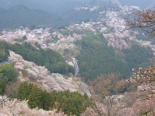 | 昨年の吉野山です。山一面の桜を望む事ができる最高のポイントです。運良く、ちょうど満開を迎えていました!!写真右上の奥に金峰山寺蔵王堂。吉野山の宿場街を一望しています。全山が桜色に染まっています。 | ||||||||||||||||