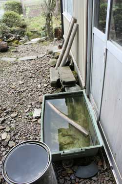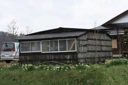 召平さん(左)のご自宅の前には、壁に杉皮を使った手作りの物置小屋。 |