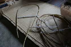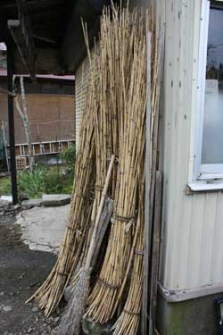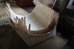 | 縁の部分に使う根曲竹。 火であぶりながら曲げて紐で固定しておく。 | ||||||||||||||||