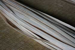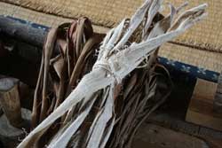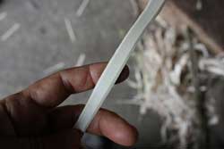 オエダラ箕の縦の部分に使う藤蔓の表皮と中芯の間の部分を薄く裂いておく。 |