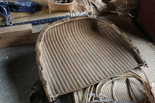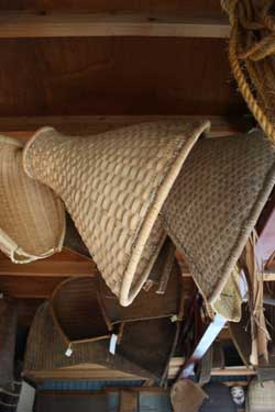 作業小屋には製作途中のオエダラ箕やたくさんの種類の箕が置いてある。 |