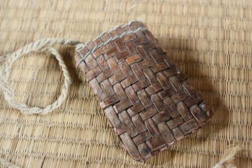 杉皮で作った鉈入れ。山に入るとその場にあるものでいろいろ作ってしまうのだとか。 |