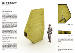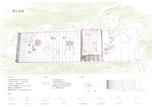 | ニンゲンが引きつけられる階段式の箱。外側にも内側にも無数の穴があって、迷路のよう。 穴を通って鉢合わせした時や、薄暗い箱の中から青空へ抜けられた時に笑顔が生まれる、子供の秘密基地のような場所を提案。 |