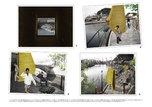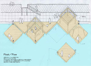 | 飫肥杉の丸太を輪切りにし、水面に浮かべる。睡蓮のように運河を彩り、ぷかぷかとゆるやかに漂う。 実現するには、輪切りの丸太に釣り糸をたらし、重りをつけて川底に沈めておく。 |