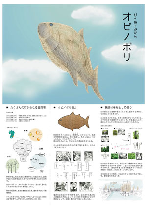 | 林業が盛んな飫肥地区、農業が盛んな細田地区、漁業が盛んな油津地区など、様々な町が合併してできた日南市。それぞれの特産を代表し、飫肥杉、みかん、魚を取り上げ、日南市が力を合わせて未来へ繋がるイメージを提案する。 飫肥杉の皮を布へ加工し(「飫肥布(オビフ)」と呼ぶ)、柑橘類で染める。それを裁縫し魚のシルエットにしたオビノボリ。 飫肥布でできたオビノボリやチョロ舟の帆で堀川運河を彩る。 |