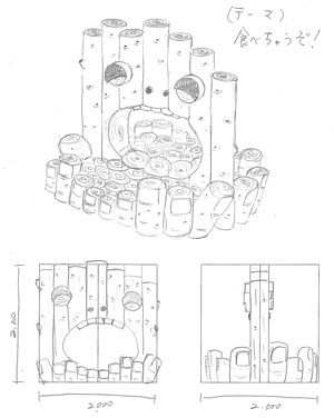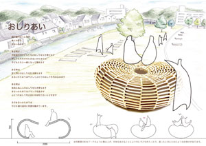 | 日南の人々が杉を育て、海へ運び、そして杉のチョロ舟で海を目指したように、日南の森のおっぱい、どんぐりは葉っぱの舟で海へゆく。 豊かな森、海をつなぎ、笑顔をうみだす杉と日南の人々との関わりをオブジェ・遊具として表現。 広場に設置する。 |